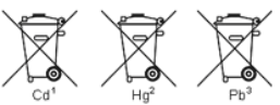Batterien und Akkus, die potenziell Schadstoffe enthalten, sind mit einem Zeichen, bestehend aus einer durchgestrichenen Mülltonne und dem chemischen Symbol (Cd, Hg oder Pb) des für die Einstufung als schadstoffhaltig ausschlaggebenden Schwermetalls versehen: